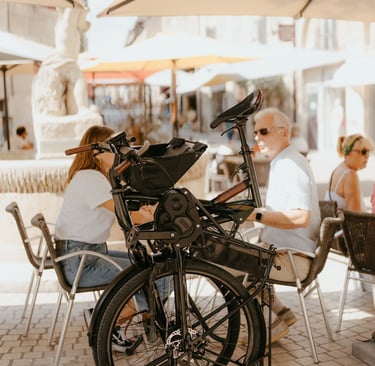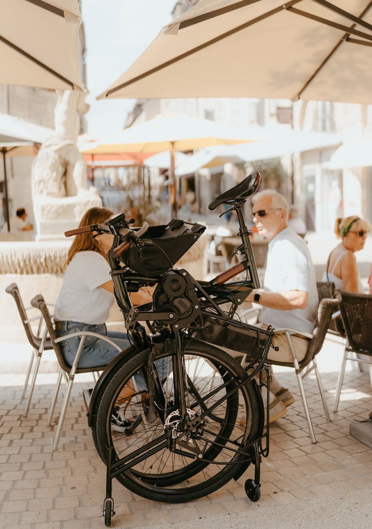Une fois plié, il se range facilement à la maison grâce à sa faible empreinte au sol, se fait petit dans un local sécurisé et reste à vos côtés au restaurant ou au bar, pour une tranquillité absolue.